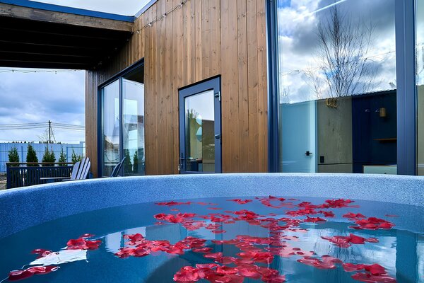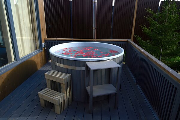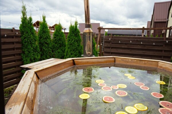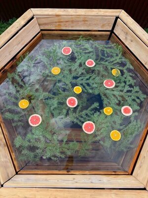 Чан украшается пихтой и свежей цитрусовой нарезкой. Горячая купель — молочком и лепестками роз или можжевеловой запаркой (при наличии, сезонно).