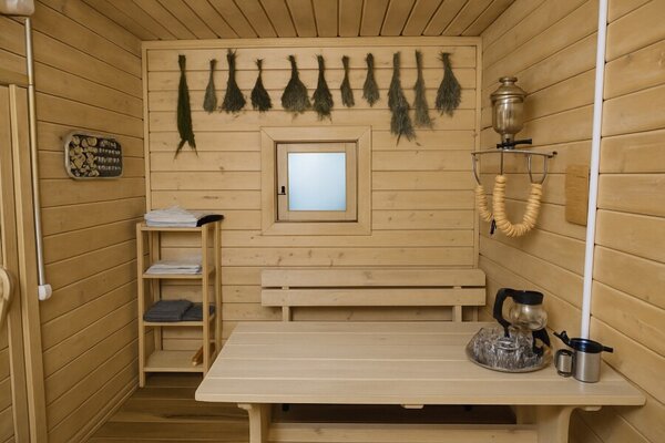Баня растапливается берёзовыми дровами и известна мягким паром и ароматами целебных трав. Здесь же — комната отдыха с мягким душистым сеном, которое обладает успокаивающим эффектом и помогает снять напряжение.