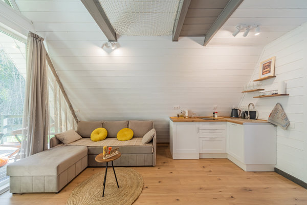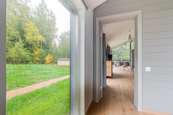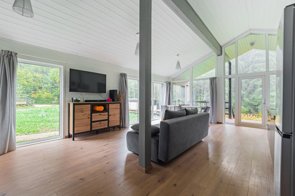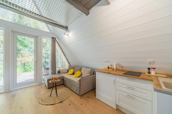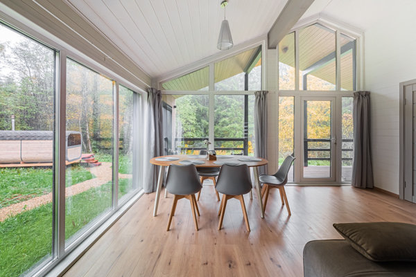 Построенные в 2022 году, каждый коттедж оснащен новой мебелью и бытовой техникой, стильным дизайном и захватывающими видами на окружающий лес через панорамные окна.