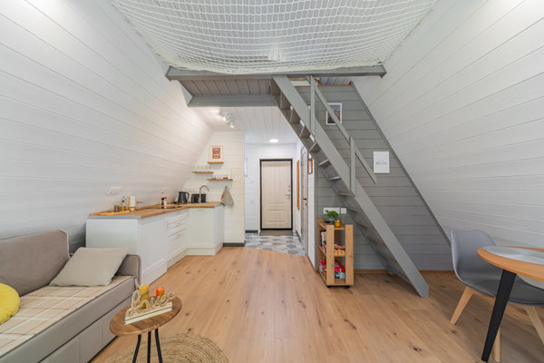 В аренду предлагаются: коттедж в стиле «А-фрейм» площадью 50 квадратных метров и более просторный коттедж в стиле «барн» площадью 100 квадратных метров. Оба расположены всего в 40 минутах езды от Москвы по Новорижскому шоссе и всего в 10 километрах от Московского автодрома, окруженные красивым хвойным лесом с рядом протекающим ручьем.