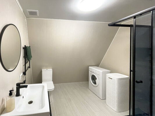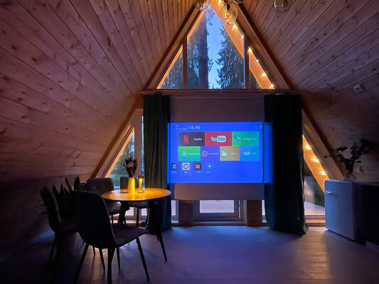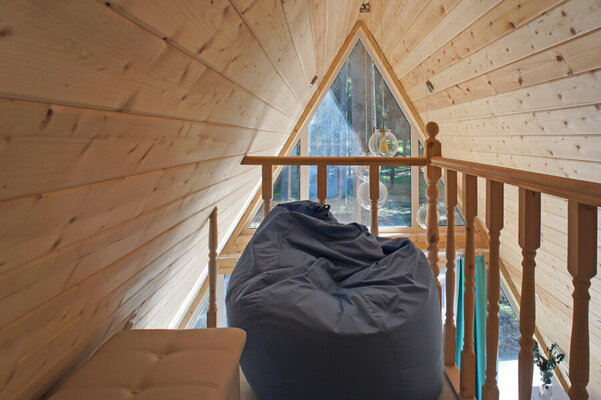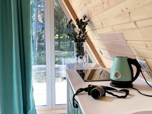 К размещению гостей предлагается уютный домик А-фрейм площадью 40 квадратных метров, рассчитанный на двух человек. На втором этаже расположена двуспальная кровать King Size, а на первом — раскладной диван. Для самостоятельной организации питания домик оборудован полноценной кухней, включающей мини-холодильник, электрическую плиту, электрический чайник и полный набор посуды. Комфортный дом-шалаш также оснащен баней с купелью и проектором для просмотра фильмов, обеспечивая полноценный досуг.
