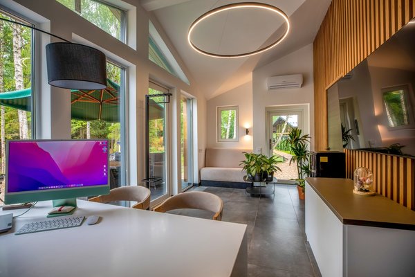 Коттеджи от 60 до 150 м2 оснащены всем необходимым для комфортного проживания в любое время года. Современная техника, кондиционеры, удобная мебель, полностью оборудованные кухни, высокоскоростной Интернет, интерьер в европейском стиле, террасы и мангальные зоны.