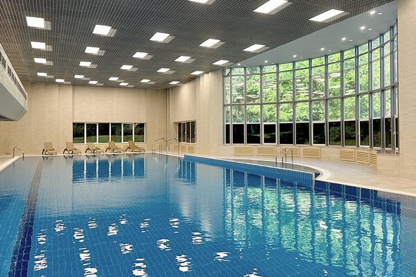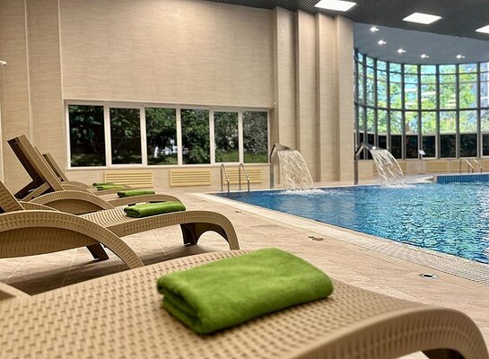 В санатории «Каникулы в Аксаково» вас ждет современный бассейн с водопадами и удобными лежаками, панорамными окнами, сауной, фитобаром и бюветом с минеральной водой. Бассейн находится в основном корпусе, что избавляет от необходимости выходить на улицу. Для посещения бассейна потребуются стандартные купальные принадлежности, включая плавательную шапочку и резиновые тапочки.