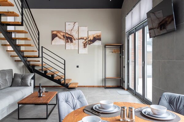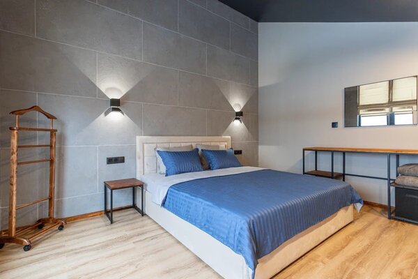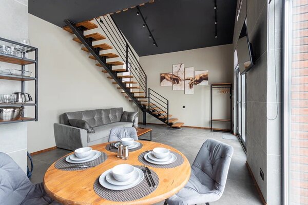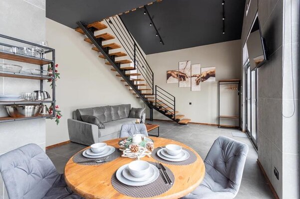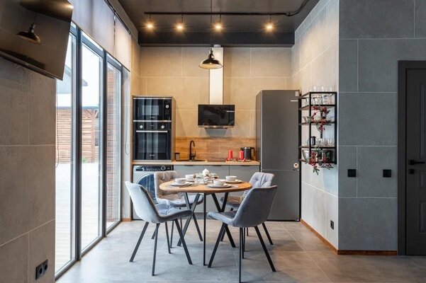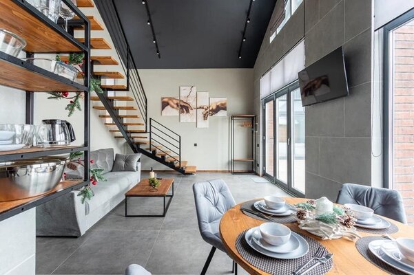 Кроме этого, в каждом коттедже имеется необходимое оборудование: варочная панель, духовой шкаф, микроволновая печь, посудомоечная машина, стиральная машина, холодильник. В части для сна гостей предлагается раскладной диван на первом этаже с дополнительным матрасом для комфортного сна вдвоем, а также двуспальная кровать и кресло-кровать на втором этаже.