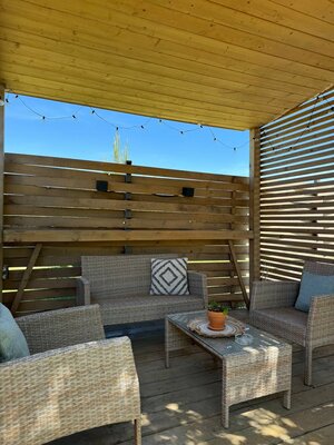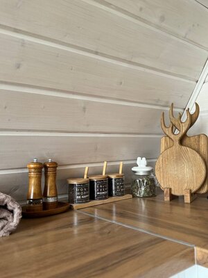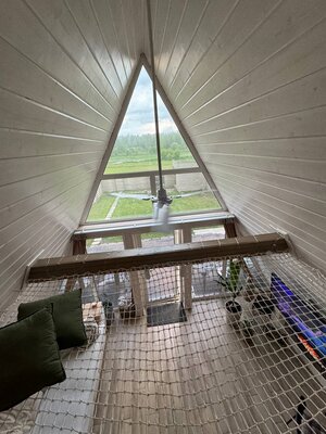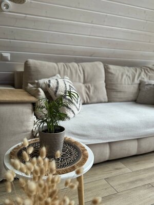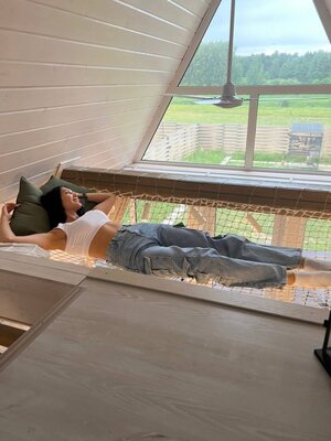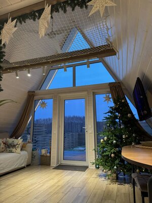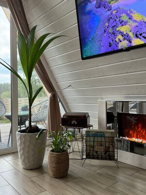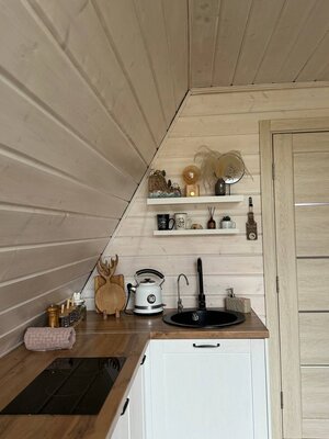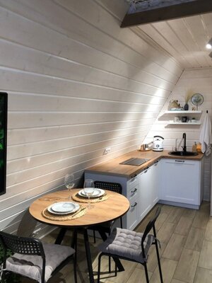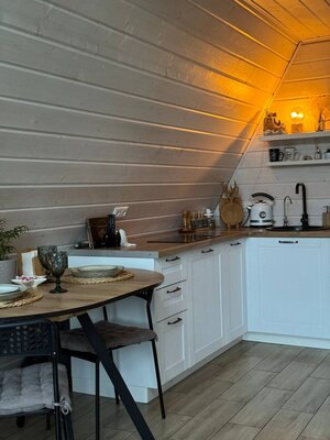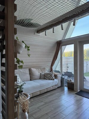 Вас ждет просторная гостиная с электрическим камином и гамаком, полностью оборудованная кухня, Smart TV, умная колонка Алиса и виниловый проигрыватель. Настольные игры, Wi-Fi и комфортный санузел обеспечат максимальный комфорт. Спальные места: двуспальная кровать King Size (на втором этаже) и раскладной диван (на первом).