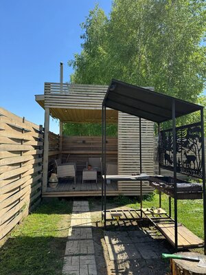 На территории: частный банный чан, мангальная зона с беседкой, а также возможность аренды каяка или квадроцикла