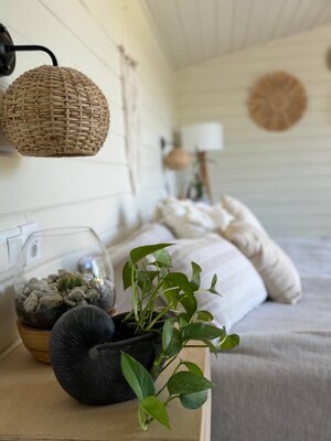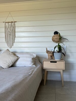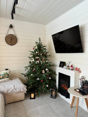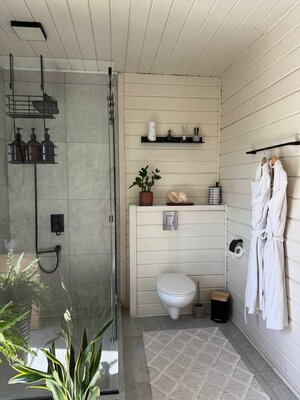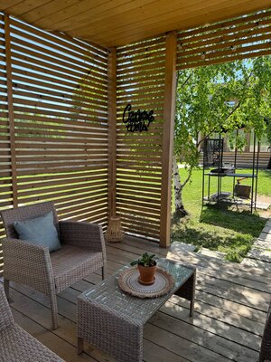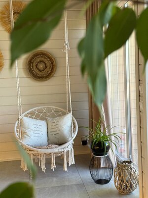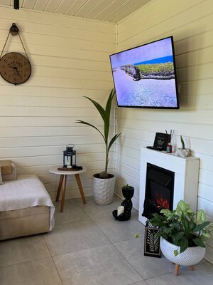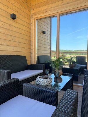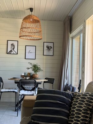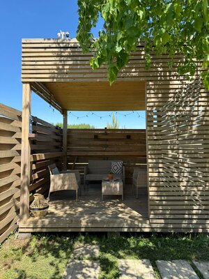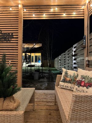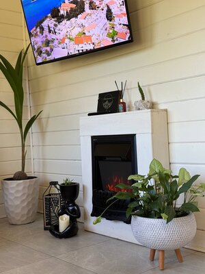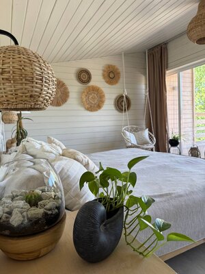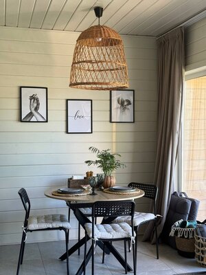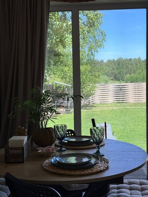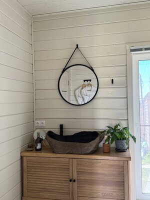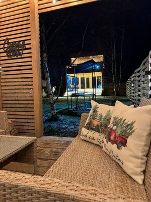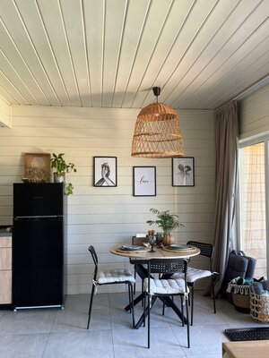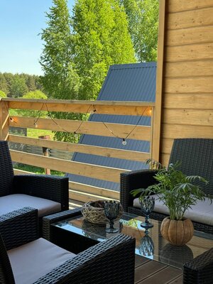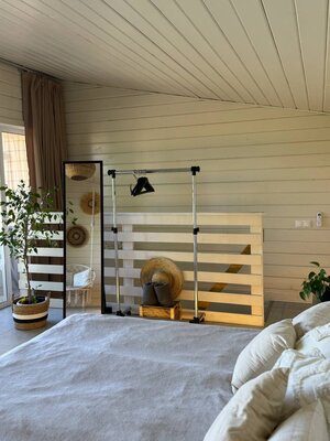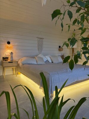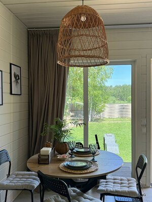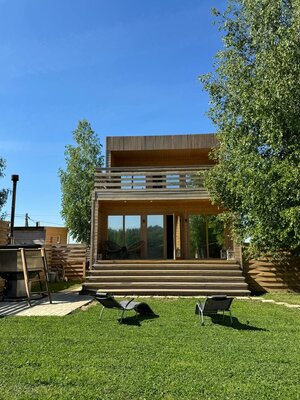 Для вашего незабываемого отдыха предусмотрена просторная спальня с подвесным креслом-гамаком и захватывающим панорамным видом на речные просторы, терраса с удобной садовой мебелью, где можно насладиться чарующими закатами и неспешным течением времени, уютная гостиная с камином, создающим теплую и романтическую обстановку для вечерних посиделок.