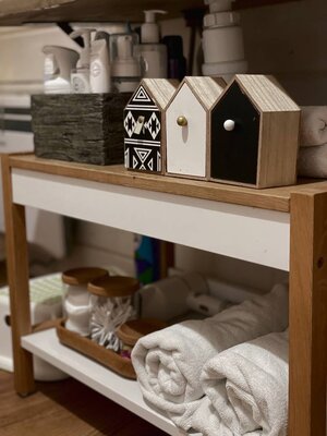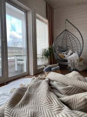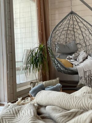 Для развлечения в гостиной установлены раскладной двуспальный диван и телевизор с функцией Smart TV, а также умная колонка с Алисой, настольные игры и бесплатный Wi-Fi.