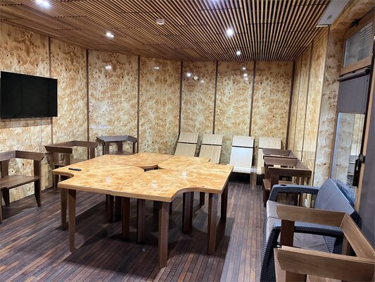 Площадь банного комплекса составляет 160 м. кв. В комплексе находится персональная раздевалка, душевая комната, парилка, комната для отдыха, массажная комната, туалет.