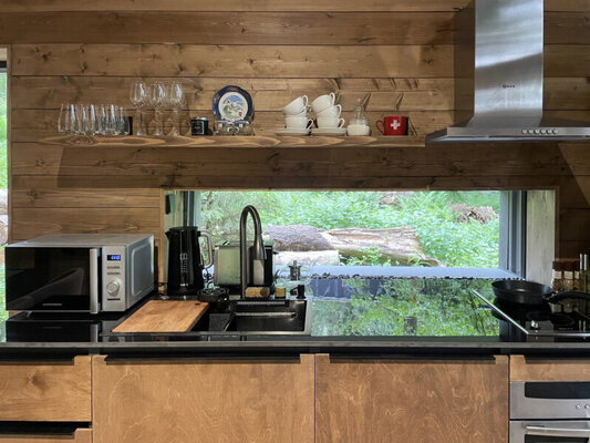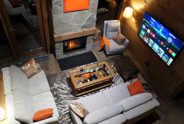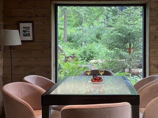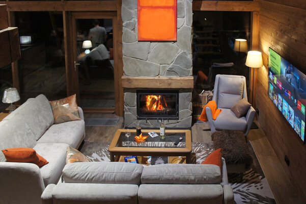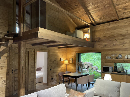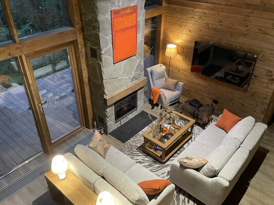 Архитектура и дизайн шале вдохновлены швейцарскими курортами, создавая атмосферу горного уюта. Фасад из натурального камня и дерева, а также панорамные окна гармонично связывают интерьер с окружающей природой. Внутри царит баланс современного минимализма и альпийского стиля: деревянные потолки, каменные элементы, изысканная мебель и продуманные детали.