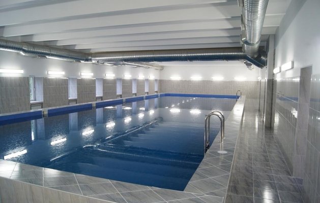 Крытый бассейн является частью спортивного комплекса. Длина бассейна 25 метров, 3 дорожки, глубина от 1.5 до 2.5 метров, температура воды 28-30 градусов, температура воздуха 26-28 градусов. Режим работы с 8.00 до 22.00 ежедневно. Просторные раздельные раздевалки, на территории раздевалок расположены удобные душевые и финские сауны.