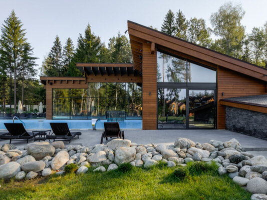 Открытый бассейн SPA-комплекса «LAGUNA» окружен живописным хвойным лесом. Благодаря системе подогрева, в бассейне поддерживается комфортная температура воды, что позволяет купаться здесь в любой сезон.