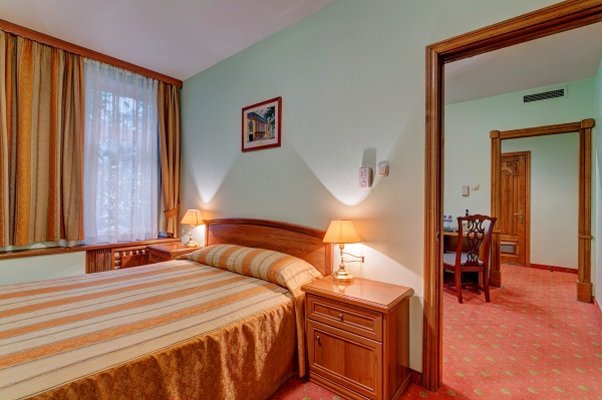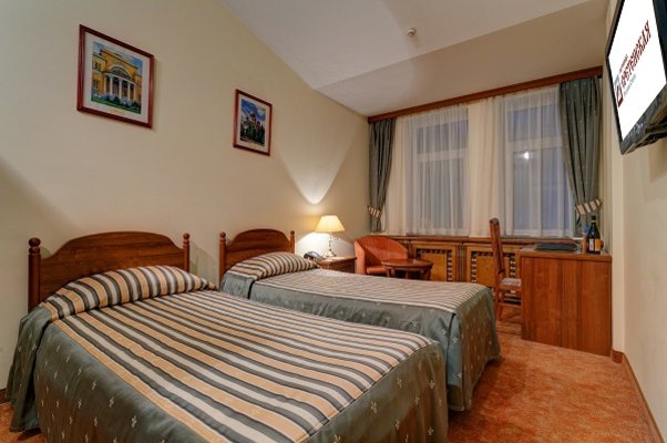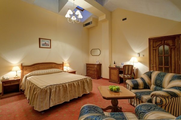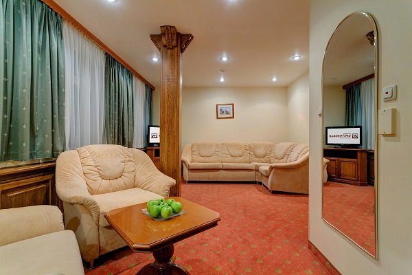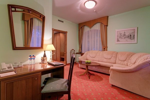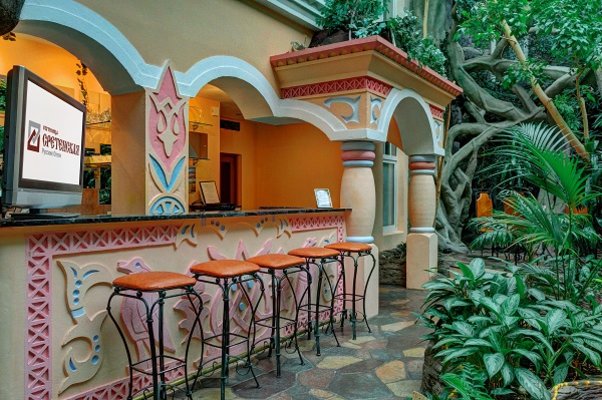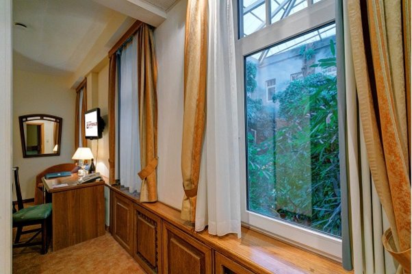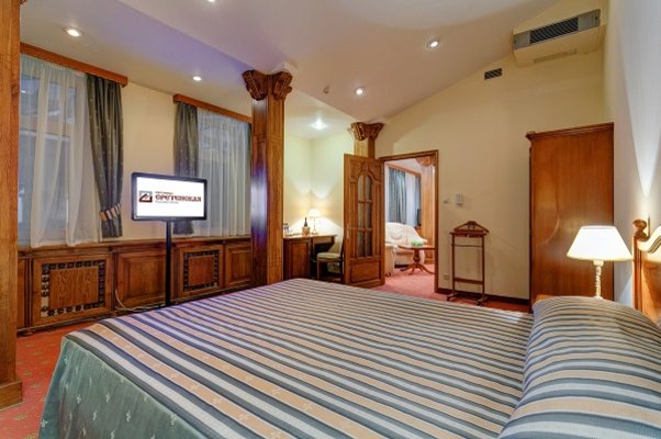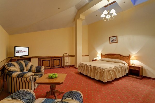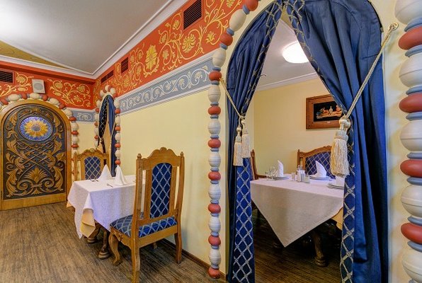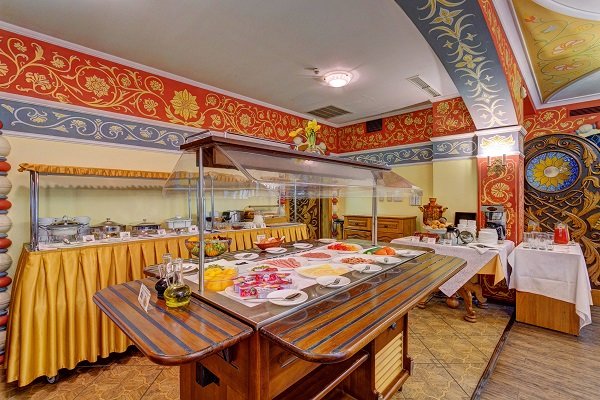 Оригинальный интерьер отеля в традициях русского фольклора – ручная лепнина, настенная роспись, кованые поручни, резная дубовая мебель, а также Зимний сад во внутреннем атриуме – создают атмосферу уюта и домашнего тепла после рабочего дня.