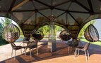 У каждого домика своё пространство с летней мебелью, диваном и зоной мангала и камина на улице. Домики специально расположены на некотором расстоянии друг от друга, чтобы обеспечить тишину и уединение гостям.