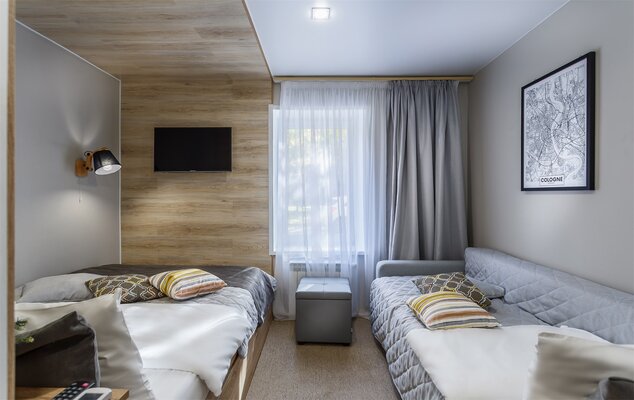 Отель размещается в уютном четырехэтажном здании, расположенном напротив Грахольского сквера. В его 12 номерах, рассчитанных на 26 человек, вас ждет современный интерьер в светлых тонах, создающий атмосферу уюта и комфорта. Каждая комната оснащена индивидуальным санузлом, кондиционером и плазменным телевизором.