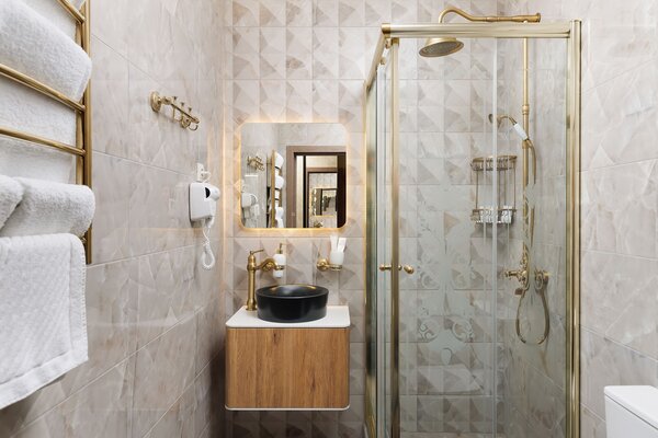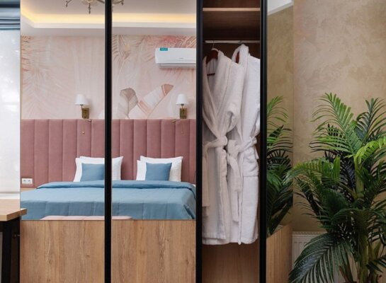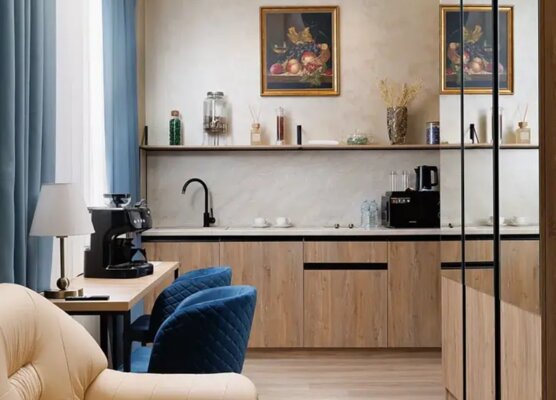 Все номера продуманы до мелочей и полностью оснащены для вашего комфортного отдыха. К вашим услугам полноценная мини-кухня с холодильником, варочной плитой, чайником, кофемашиной и набором посуды, телевизор, бесплатный Wi-Fi и современный санузел с душем. Дизайнерский ремонт в спокойной цветовой гамме создает идеальную расслабляющую атмосферу.