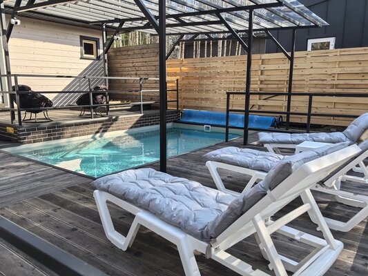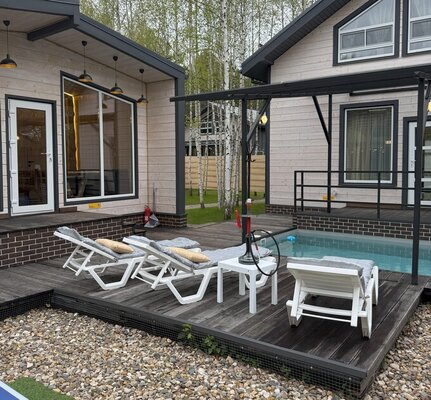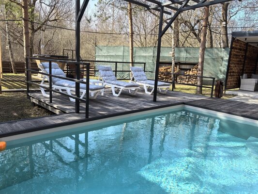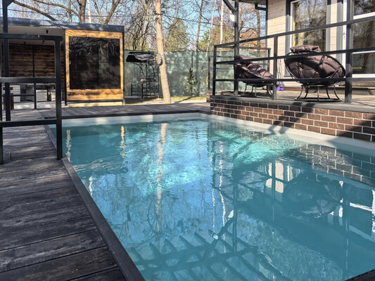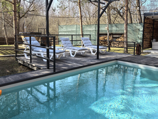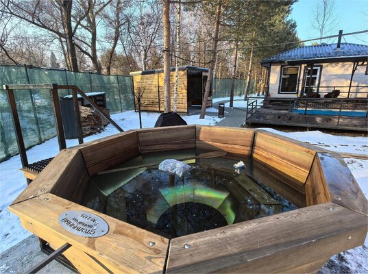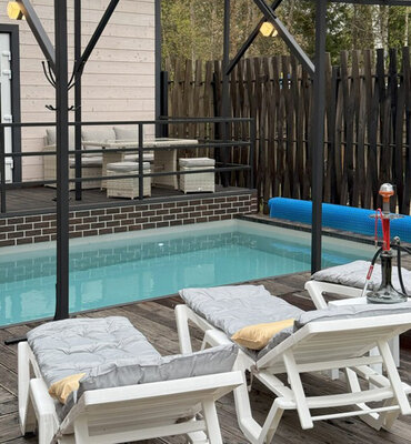 На свежем воздухе расположен подогреваемый бассейн, окруженный удобными шезлонгами, где можно насладиться отдыхом после купания. При бронировании бани посещение бассейна становится бесплатным, что позволяет гостям полностью расслабиться и насладиться водной стихией.