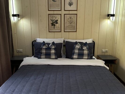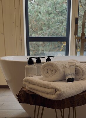 В доме два отдельных санузла с ванной, душем и всем необходимым для комфорта: мягкими полотенцами, туалетными принадлежностями и средствами гигиены. После дня, проведенного на природе, вас ждет настоящая релаксация в купели и домашней сауне с вениками и простынями.