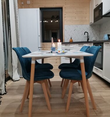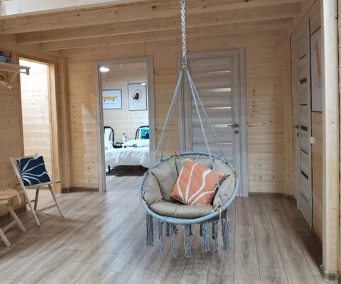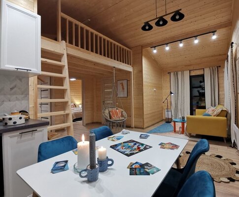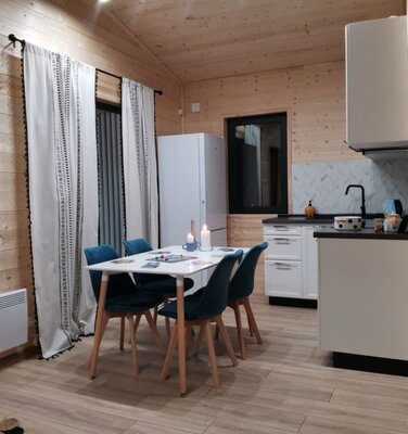 К услугам гостей — просторный коттедж, полностью меблированный и оснащенный всем необходимым для комфортного проживания, включая удобную кровать и отдельную обеденную зону.