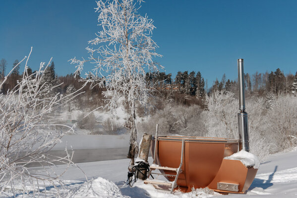 Купание в чане на берегу реки дарует не только физическое тепло, но и душевное умиротворение. Горячая вода у ног словно обволакивает, смывая усталость и тревоги. Это идеальный способ восстановить силы и укрепить здоровье, и особенно приятно разделить это с друзьями.