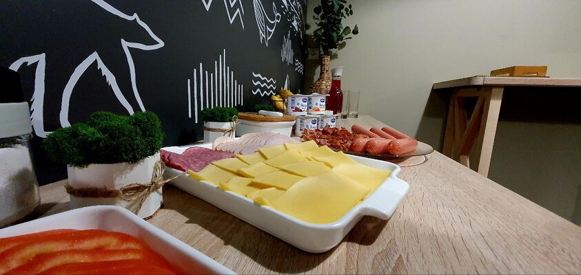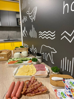 Каждое утро для гостей сервируется континентальный завтрак. Если вы предпочитаете готовить самостоятельно, к вашим услугам общая кухня со всей необходимой бытовой техникой и посудой. В непосредственной близости от отеля находятся кафе «Сим-Сим» и продуктовый гипермаркет.