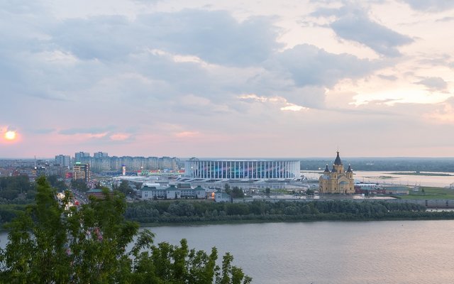Была в Азимуте 3 дня в мае. Территория отеля (цвели яблони)и вид на Волгу встречающейся с Окой не может не понравится. Новый стадион к чемпионату тоже видно. Номер мне достался с видом не на Волгу...
