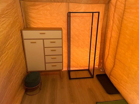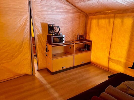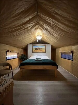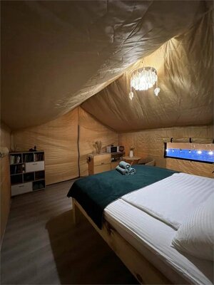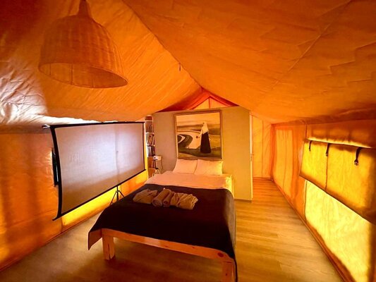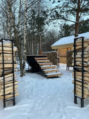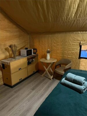 Возле сафари-тентов расположился классический банный чан, предоставляющий уникальную возможность расслабиться на свежем воздухе. Это идеальное место для семейных выходных или романтического свидания, где можно наслаждаться атмосферой уединения и гармонии с природой.