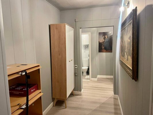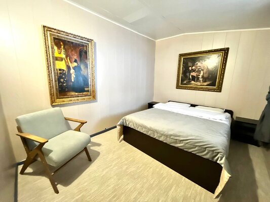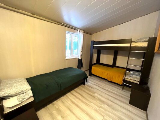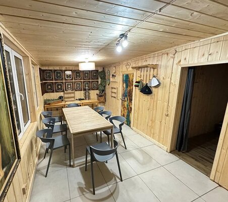 Гостей ожидает удобная общая кухня, где они могут порадовать себя кулинарными шедеврами. Оснащенная всем необходимым — от холодильника для продуктов до плиты и чайника — кухня предлагает полный набор посуды, чтобы сделать приготовление еды приятным и комфортным.