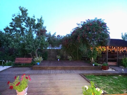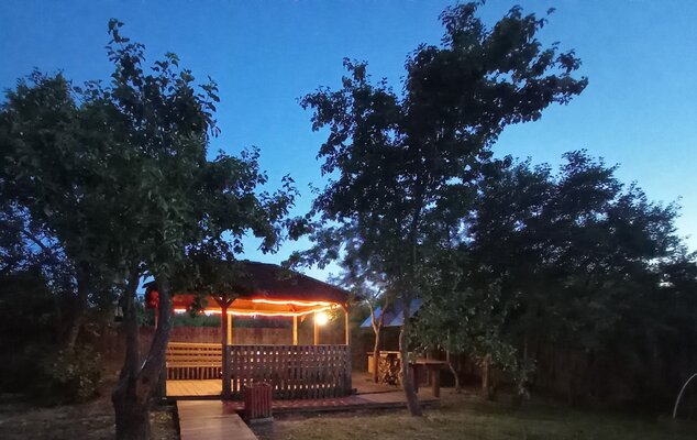 Гости могут провести время в одной из яблоневых садовых беседок, приготовить шашлык или уху на удобно расположенных мангалах. Беседки обставлены и оснащены электричеством для удобства гостей.