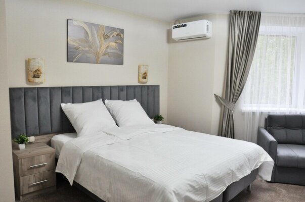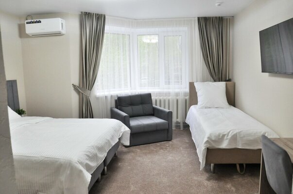 К услугам гостей предлагаются светлые и функциональные номера различной вместимости. Каждый номер оснащен удобными кроватями, шкафом для одежды, телевизором и зоной отдыха. В зависимости от категории, санузел оборудован душем или полноценной ванной.