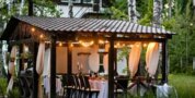 Уютная беседка в аутентичном баварском стиле — идеальная камерная локация для банкетов на природе до двадцати гостей, где можно насладиться уединенной атмосферой и живописными видами.