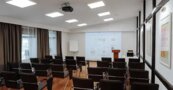 Просторный зал площадью сто двадцать квадратных метров со сценой, проектором и экраном служит универсальной площадкой для свадеб, юбилеев, торжественных ужинов и корпоративных мероприятий.