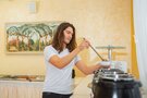 Здесь удобная плетеная мебель как под навесом, так и на открытой территории. Большинство кулинарных мастер-классов проводятся на свежем воздухе, включая приготовление блюд на мангале. Наслаждаться блюдами ресторана, любуясь рекой и лесом на открытой площадке за рестораном — идеальное место для этого.