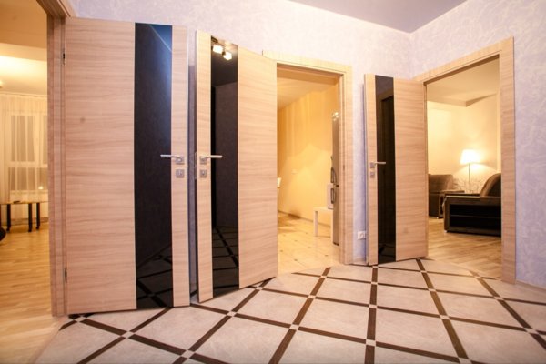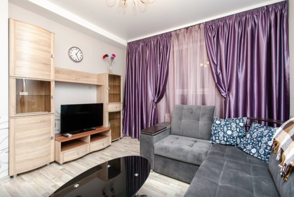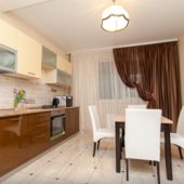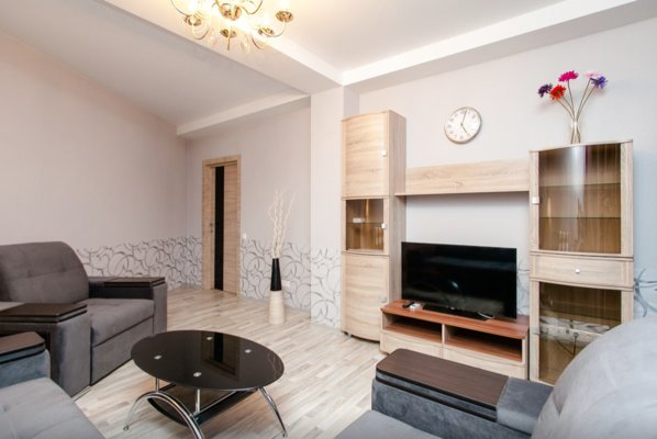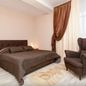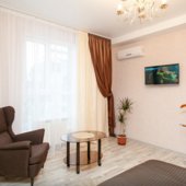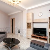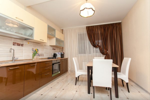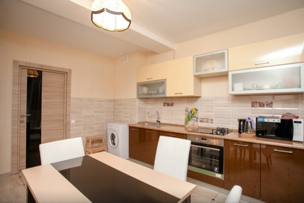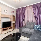 Интерьер выполнен в классическом стиле и светлых тонах. В апартаментах располагается спальня, гостиная зона, кухня. Ванная комната оснащена стандартным набором сантехники с туалетно-гигиеническими принадлежностями. С панорамных окон балкона открывается живописный вид на город.
