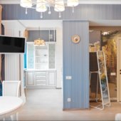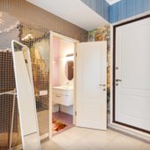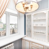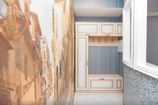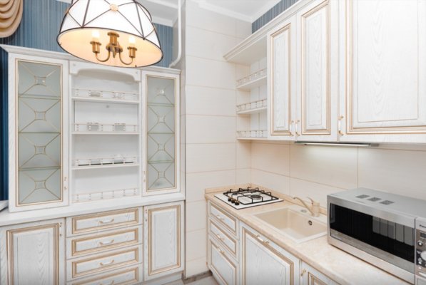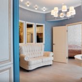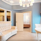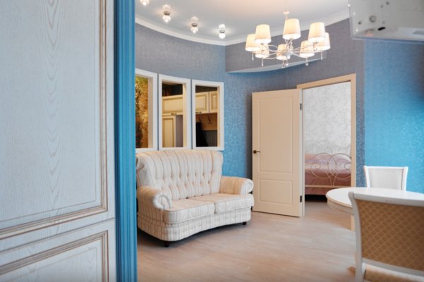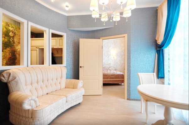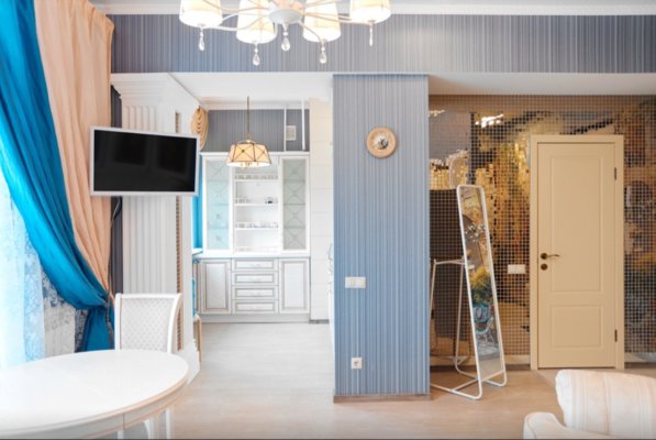 Интерьер выполнен в классическом стиле и светлых тонах. В апартаментах располагается спальня, гостиная зона, кухня. Ванная комната оснащена стандартным набором сантехники с туалетно-гигиеническими принадлежностями. С панорамных окон балкона открывается живописный вид на город.
