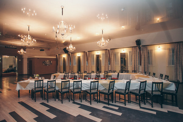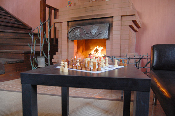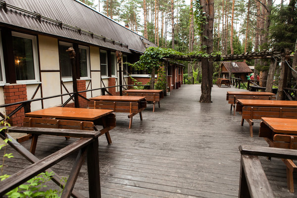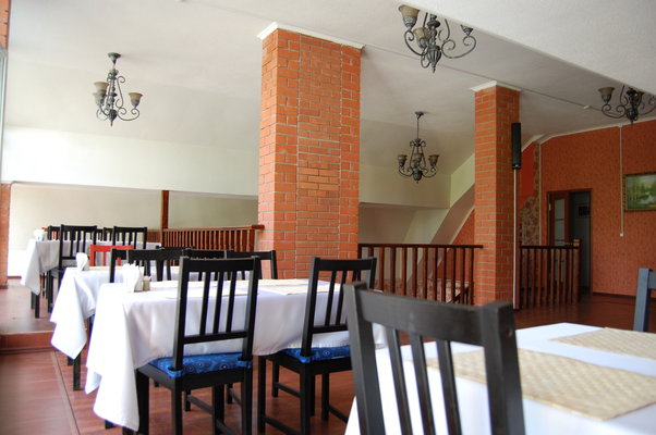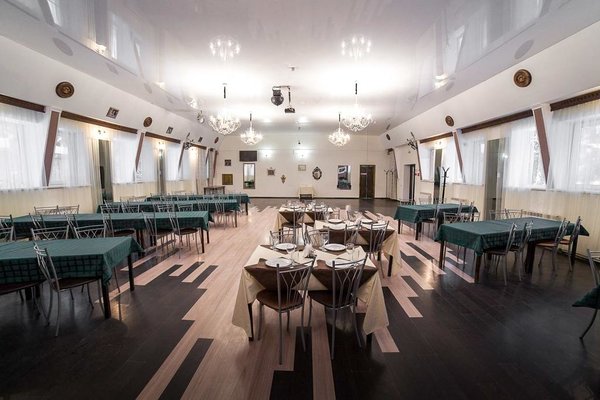 Турбаза располагает уютным кафе. Из окон кафе на втором этаже можно полюбоваться прекрасным видом на сказочный пруд с фонтаном. На первом этаже есть уютный каминный зал. Гостям предлагают разнообразные блюда русской и европейской кухонь, большой выбор безалкогольных и алкогольных напитков.