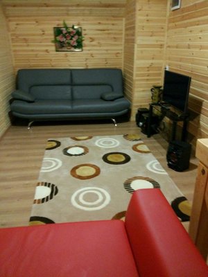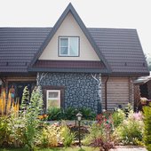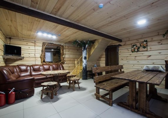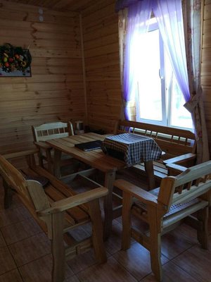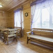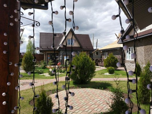 Дом для отпуска «Зеленый островок» с садом расположен в поселке Малое Козино. Гости могут отдыхать на террасе.