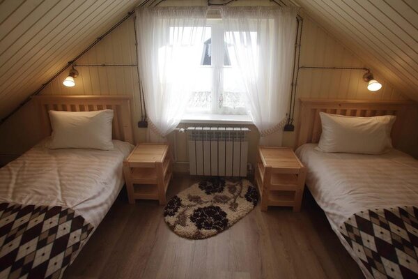 К услугам гостей комфортабельные деревянные коттеджи, предлагающие уютные двух- и трёхкомнатные номера, рассчитанные на проживание от четырёх до шести человек. Каждый коттедж оснащен современной кухней со всем необходимым: микроволновой печью, мини-холодильником, газовой плитой и чайником. В номерах также есть телевизор, стиральная машина и собственный санузел с душевой кабиной и туалетными принадлежностями.