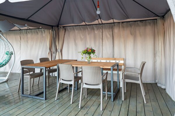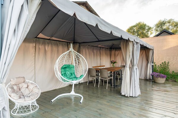 На обустроенной придомовой территории есть мангал и зона отдыха под навесом, где гости могут насладиться красотой природы и свежим воздухом.