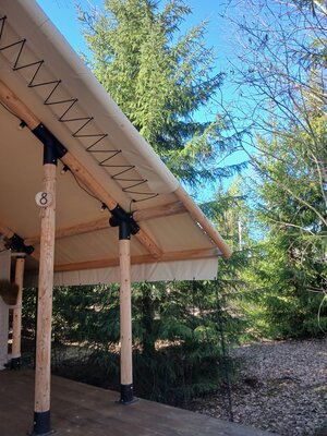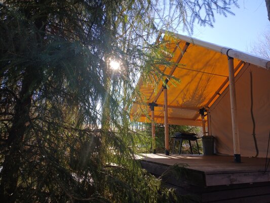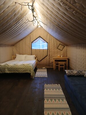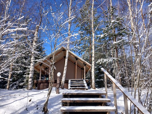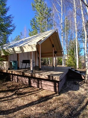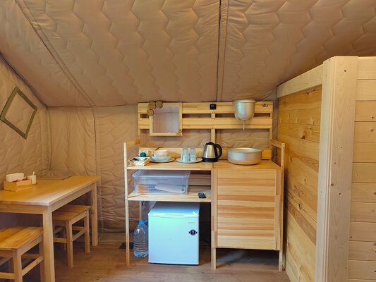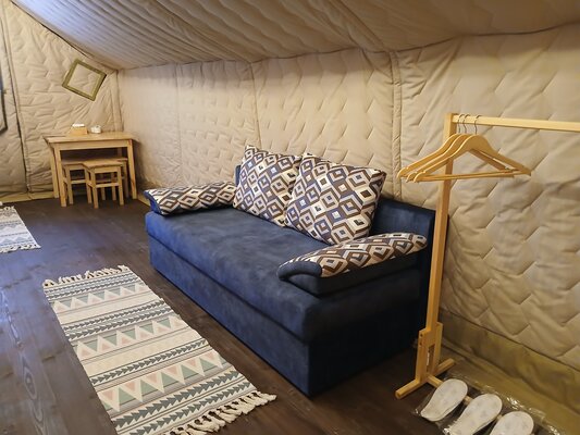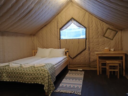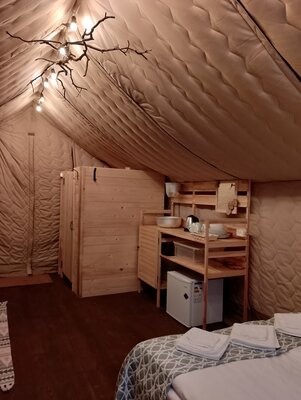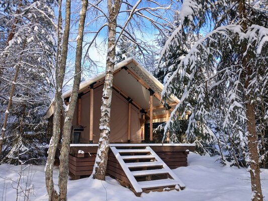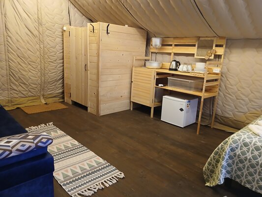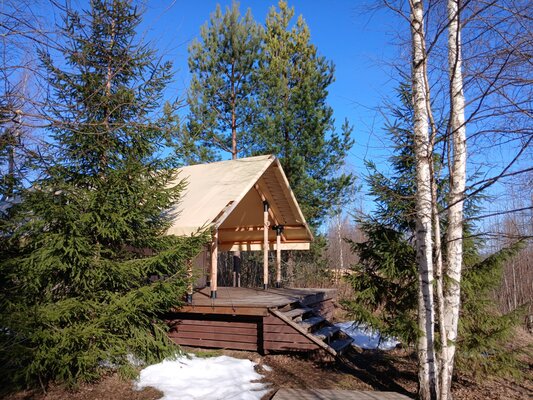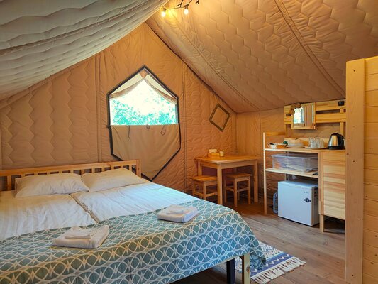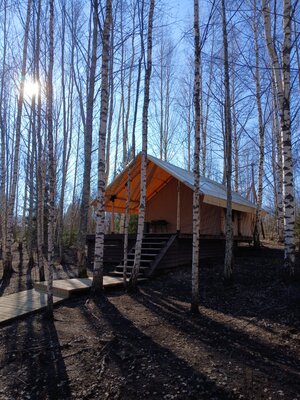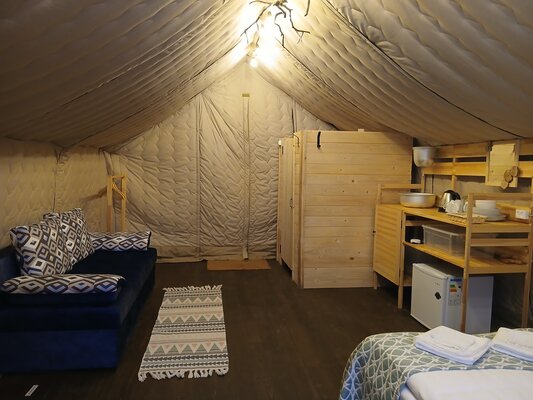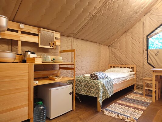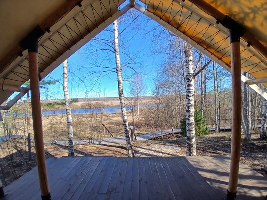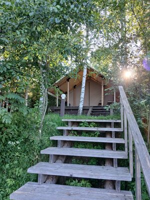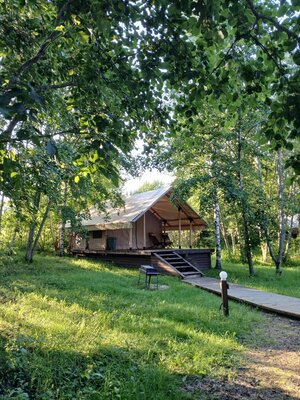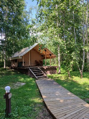 Десять стильных сафари-тентов, расположенных вдоль живописного берега реки Мста, ждут вас. Каждый оборудован всем необходимым для круглогодичного проживания: холодильником, микроволновкой и полным набором посуды. Вам также гарантированы личные душ, туалет и умывальник на весь период отдыха.
