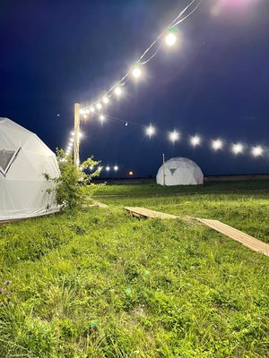 «Космосфера» — это впечатляюще красивый глэмпинг, расположенный на живописном побережье озера Ильмень. Оборудован удобный спуск к воде.