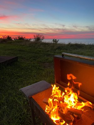 В глэмпинге имеется зона барбекю, где можно разводить костры. Она оборудована удобными стульями-адирондак и столами для большой компании.