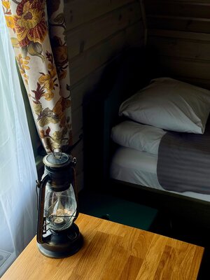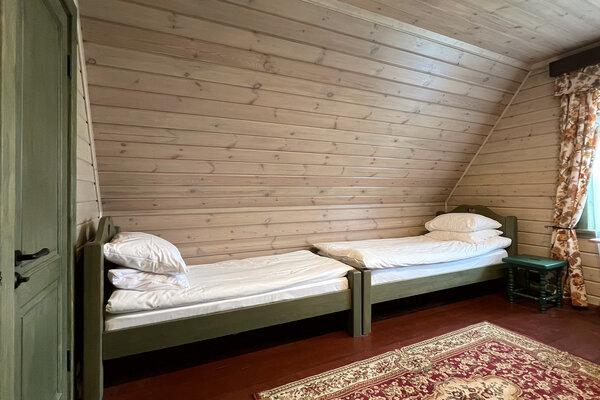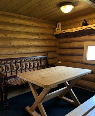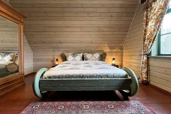 Коттедж предлагает все необходимое для комфортного проживания: удобную прихожую, просторную гостиную, совмещенную с кухней и русской печью, которая согреет в прохладные вечера, а также полноценную ванную комнату. На втором этаже расположены две спальни, рассчитанные на пять человек. Особой популярностью у гостей пользуется спальня с кроватью в виде саней — говорят, в ней снятся самые сладкие сны.