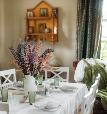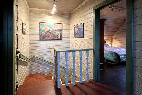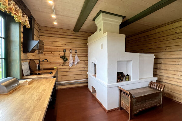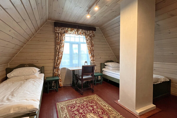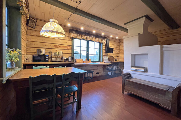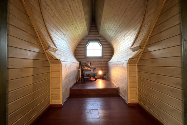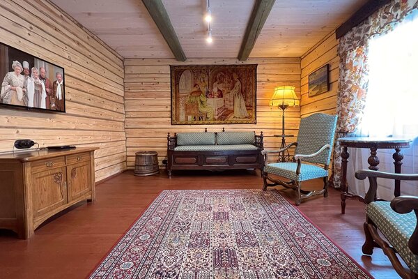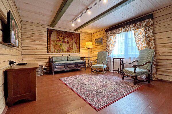 Внешний вид коттеджа словно перенесен из старинной сказки: классический деревянный сруб, изящная башенка и резные украшения создают неповторимый облик. Внутри вас ждет обстановка, наполненная теплом и уютом. Здесь хочется рассматривать каждую деталь – от старинного сундука до резной прялки, ощущая себя не просто гостем, а частью истории.
