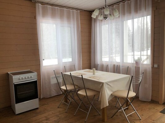 В коттедже «Лесной» раздвижной стол на 10 человек, в коттедже «Луговой» — на 8 человек.