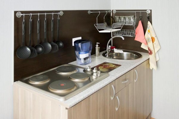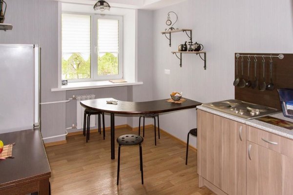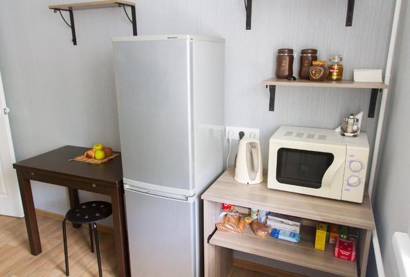 Общая кухня хостела занимает немаленькую площадь, здесь установлен большой обеденный стол, поэтому места хватит всем. Кухонный блок прекрасно оборудован техникой, что облегчает и ускоряет приготовление разных блюд на завтрак, обед и ужин.