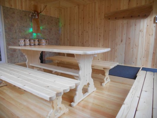 На территории есть просторная летняя терраса, зона для барбекю и площадка для занятий на свежем воздухе. Кроме того, гостевой дом организует баню и имеет крытый плавательный бассейн размером 5 на 11 метров. Для любителей активного отдыха можно арендовать сезонный спортивный инвентарь.