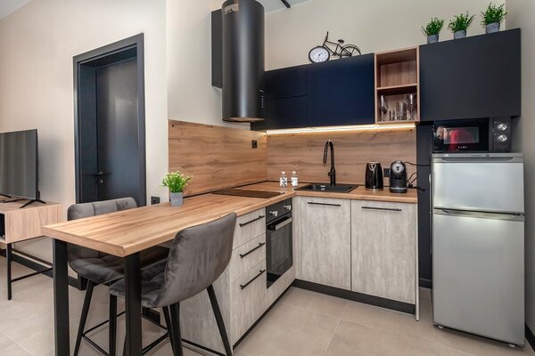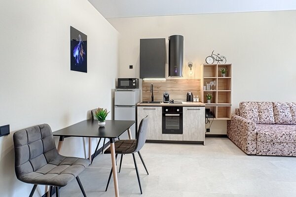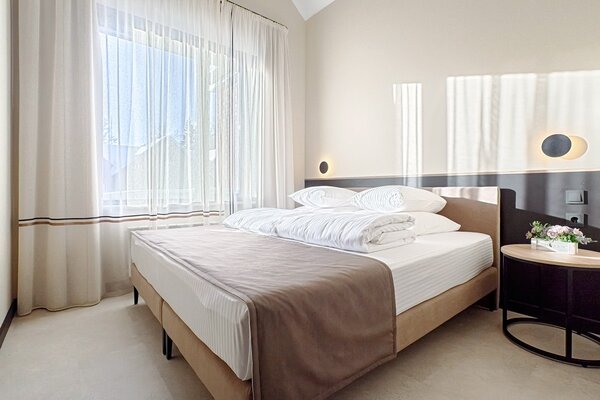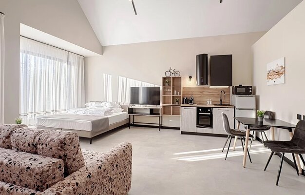 В каждом номере отеля представлена двуспальная кровать, укомплектованная кухня и обеденная зона, а также ванная комната со всеми удобствами. Весь комплекс оборудован парковочной зоной, детскими и спортивными площадками, прокатом спортивного инвентаря в соответствии с сезоном. Также на территории присутствуют кафе и ресторан-реберная «Бобер».