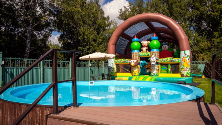 Большой бассейн с подогреваемой водой под открытым небом. Удобные шезлонги, бесплатные полотенца, комфортные кабинки для переодевания, VIP–зоны, оригинальный душ–дерево, бар, кальяны и музыка, детский бассейн и батут.