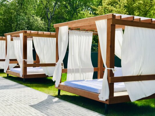Аренда беседок доступна только для проживающих. Уголь, решетку, жидкость для розжига можно приобрести в отеле. Беседки доступны для аренды с 10:00 до 22:00, возможно принести свою еду и алкогольные напитки.